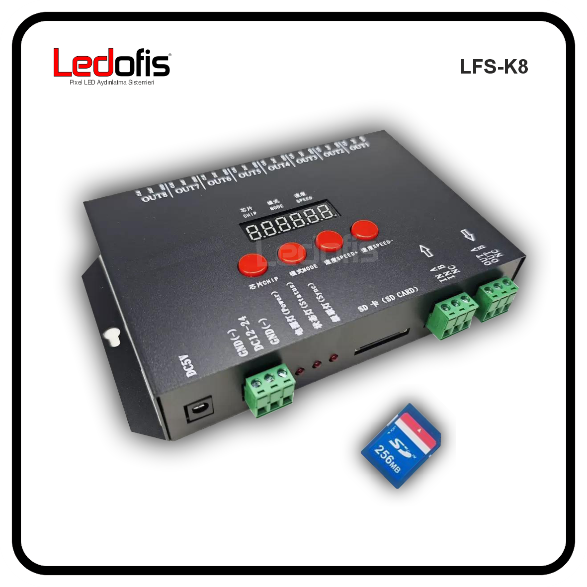 K-8000CK, A+RGB Magic Progranabilir LED Control Cihazı, 8 Port Her Port 1024IC Çalıştırır toplam 8192IC, 128MB ile 32GB arası SD kartları destekler, 22 çeşit dahili efekt bulunur, DC5V ile DC24V arasında çalışmaktadır
