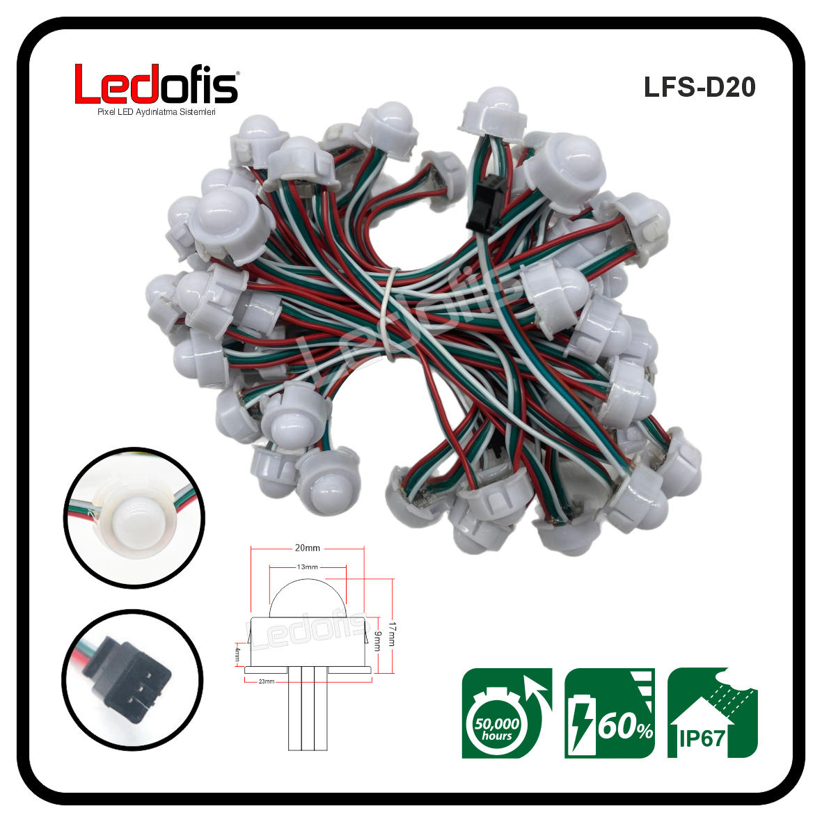 A-RGB Pixel LED 20mm DC 5volt 0.60mA 0.72 watt dış mekan IP67 (Bağ 50 adet)